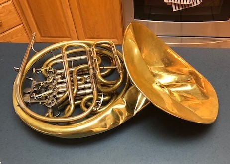 This horn was scheduled in to repair a loose brace but arrived having been run over by a truck!